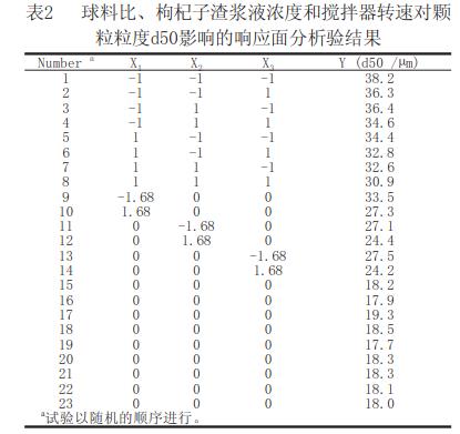 影響球磨機(jī)超微粉碎效果的主要因素有球料比、攪拌器轉(zhuǎn)速、枸杞子渣漿液濃度和粉碎介質(zhì)。因此本研究以上述3個(gè)因素作為試驗(yàn)因素,固定球磨介質(zhì)為Φ10mm氧化鋯球,在單因素試驗(yàn)的基礎(chǔ)上,通過響應(yīng)面分析化佳工藝參數(shù),以粉碎后的顆粒粒度d50作為超微粉碎評(píng)價(jià)效果。