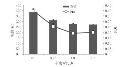 2.1.3研磨時間的篩選稱取BRE原料藥7.5g,置于含有吐溫80(1.125g)的水溶液(22.5mL)中,攪拌混懸,加入氧化鋯珠(粒徑為0.6mm)450g,分別研磨0.5、0.75、1.0、1.5h,制備3批BRE納米晶混懸液。以BRE納米晶混懸液的粒徑、PDI為指標,篩選研磨時間。結果,隨著研磨時間的延長,BRE納米晶混懸液的粒徑、PDI逐漸減??;研磨0.5、0.75、1.0h時,BRE納米晶混懸液的粒徑、PDI減小的幅度較大;研磨1.5h時,BRE納米晶混懸液粒徑雖然較研磨1.0h時的粒徑減小,但減小幅度不大。綜合考慮能耗和時間,確定研磨時間為1h。研磨時間的篩選結果見圖3。